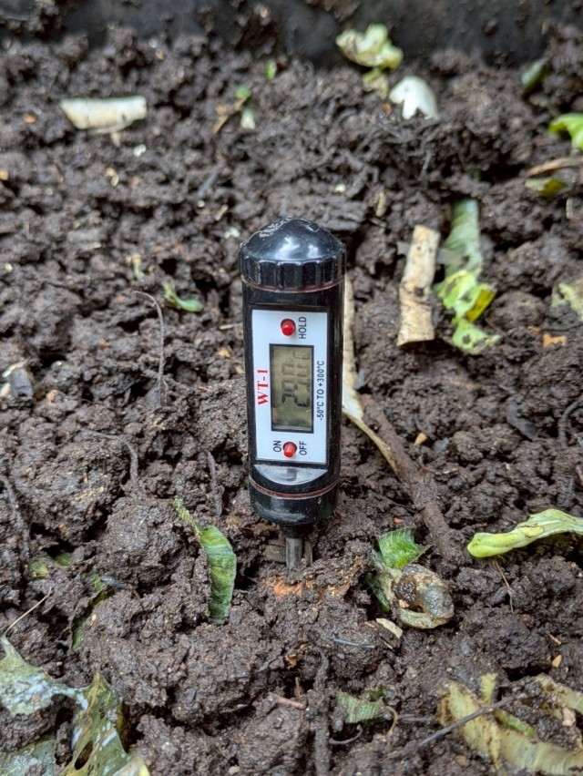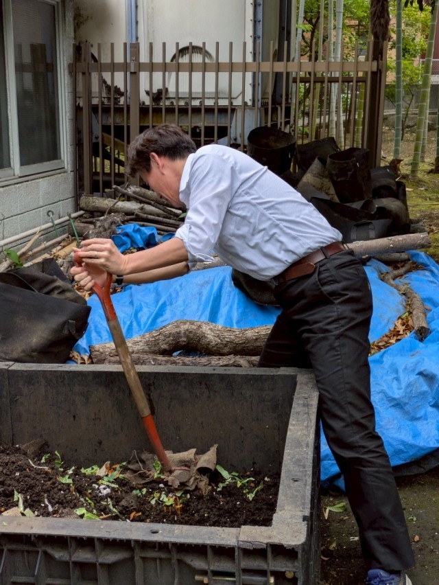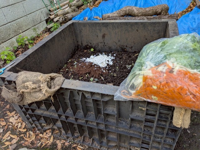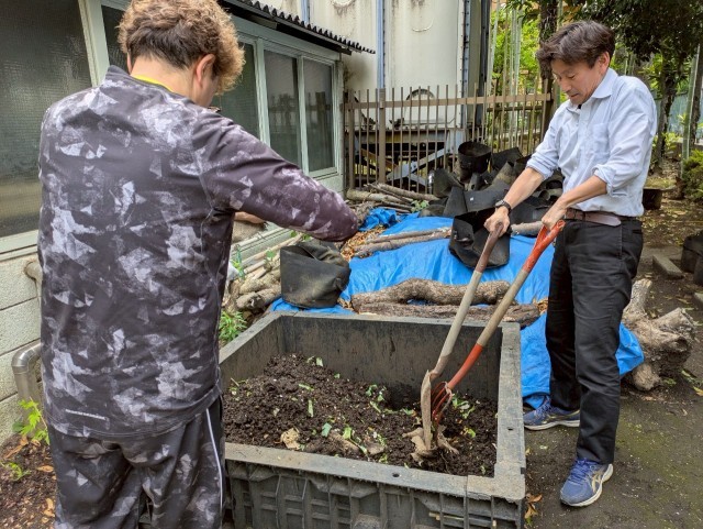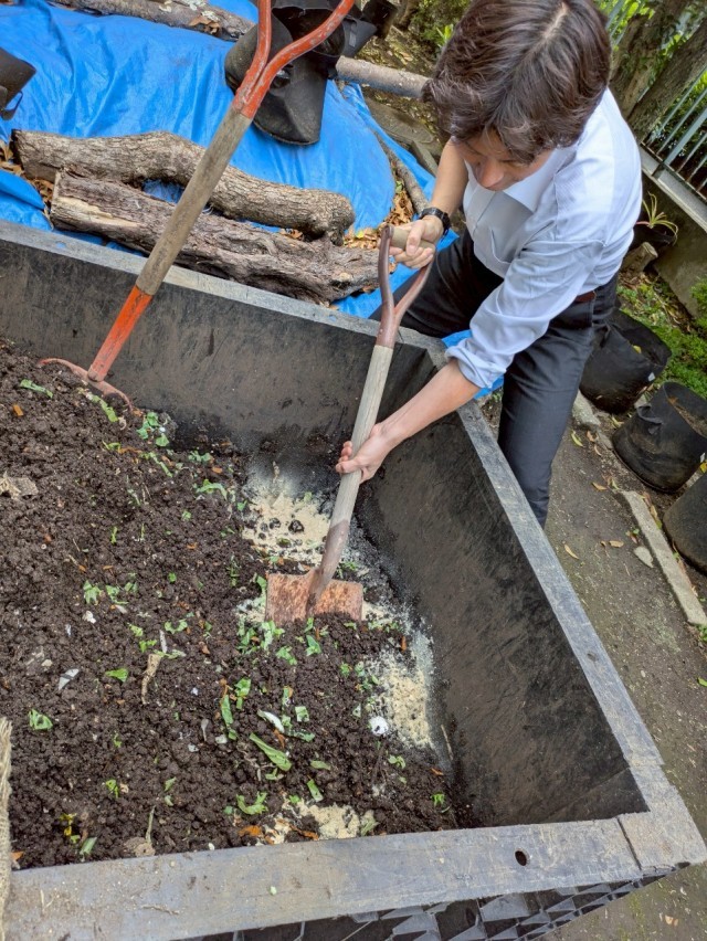 土が発酵すると 熱を帯びてくるそうです 給食で使用しない部位を包丁で細かくカットし 分解しやすいように・・・