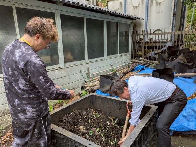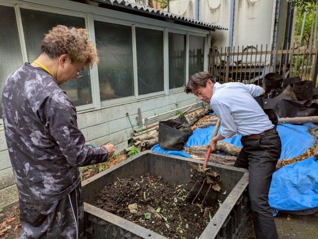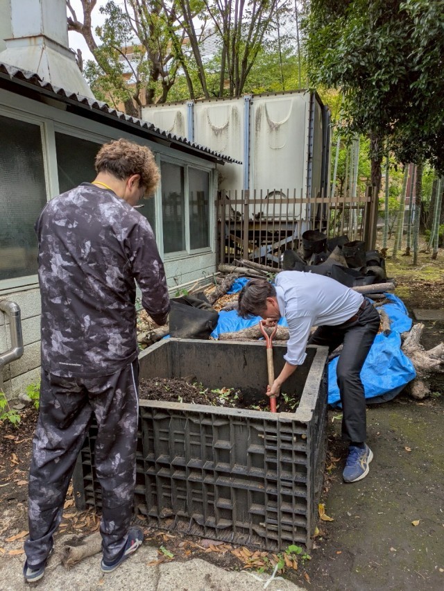 さて、写真の内容は、昨日の放課後の様子です。 学校に設置してあるコンポストでの土づくりの様子です。