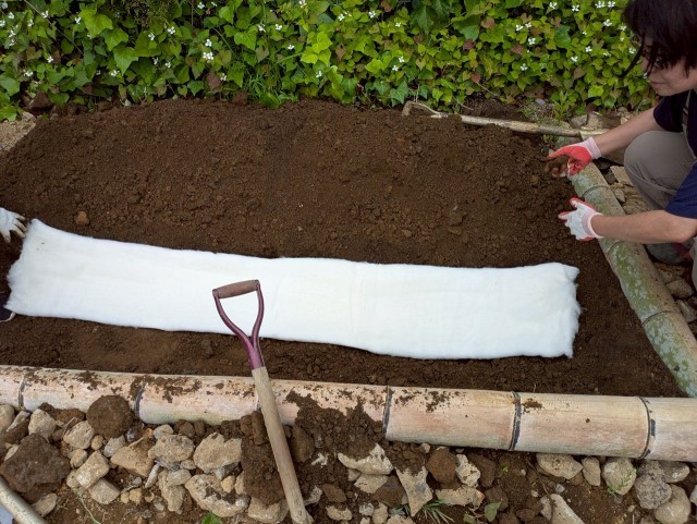 写真の白いものは、綿で 綿入れという作業をしています。 よりよく芋が育つための手立てとして、行っています。