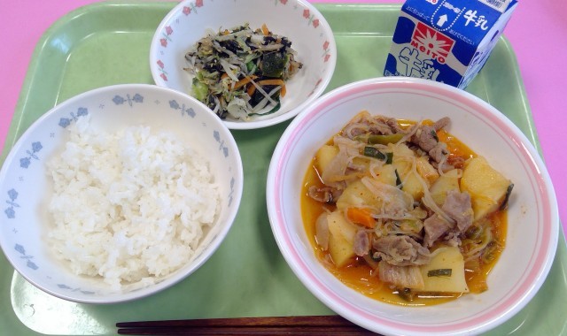 ピリ辛肉じゃがは、じゃがいも、玉葱、人参、豚肉の他に、にんにくや、ニラ、しらたき、白菜キムチなどが入り、具だくさんの肉じゃがとなっています。通常の肉じゃがも人気ですが、ピリ辛肉じゃがも人気で、今日はどのクラスもほぼ完食でした。天候が不順で体力が落ちやすい時期ですが、気候に負けずに元気に過ごしましょう。