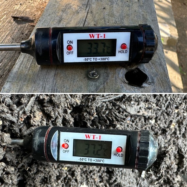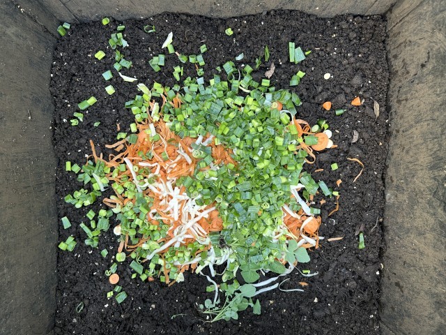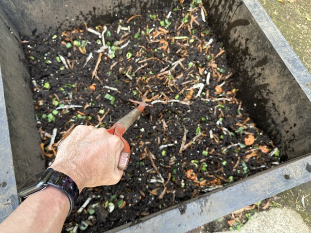 33.7度の真夏日を迎え、今日も元気に野菜を刻みます。堆肥の温度もそれに比例して上昇中。麻袋もずいぶんと柔らかくなってきました。