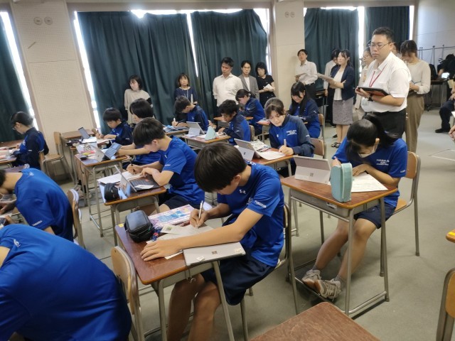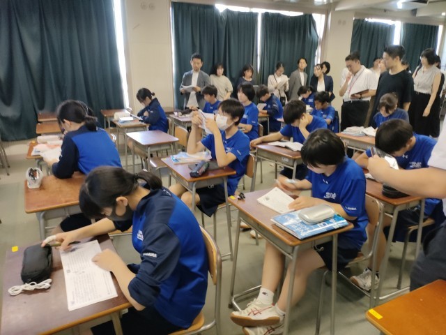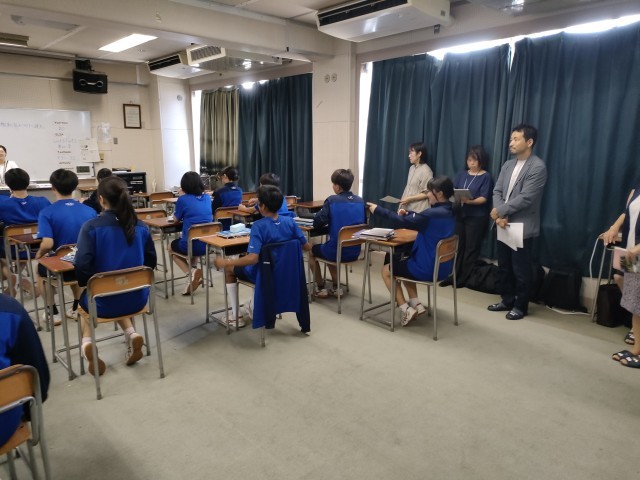 区内の小中学校の英語教育担当の先生が本校に集まり、英語の模範授業を参観しました。