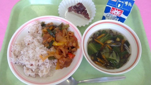 給食では、雑穀ごはんと夏野菜を使った炒め物を作りました。