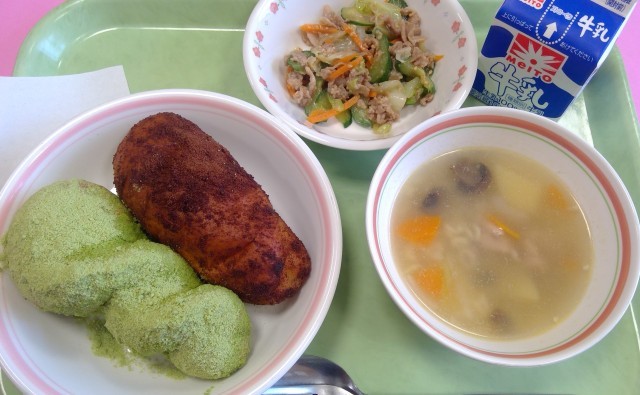 本校の抹茶揚げパンは、全てが抹茶の粉ではなく、うぐいすきな粉と合わせてできています。