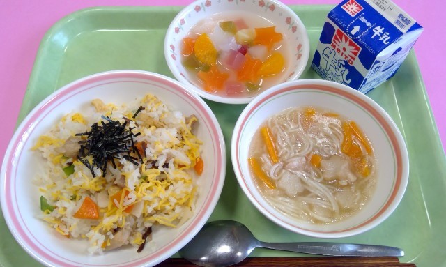 給食のそうめん汁には、短冊の形に切った人参や星形の麩、デザートのカルピスポンチには、星形のゼリーとナタデココが入っていました。