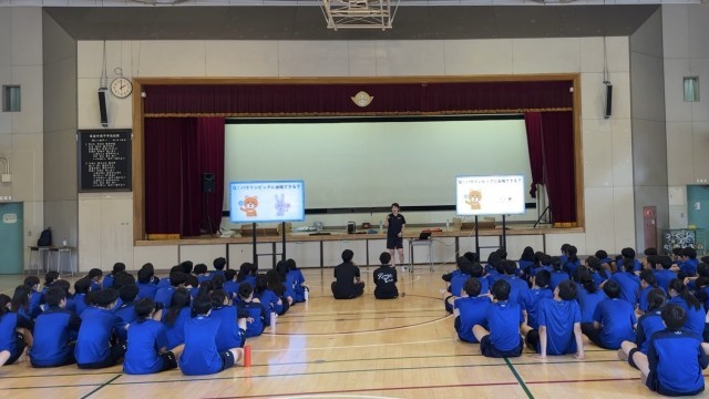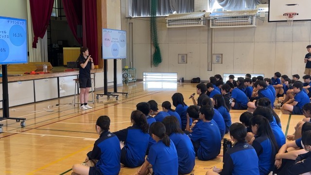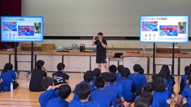 デフサッカー体験が実施されています。1時間目が講演ということで耳の聞こえない方とスポーツの関わりについて、らまたデフリンピックについての講話が手話通訳を通して行われました。