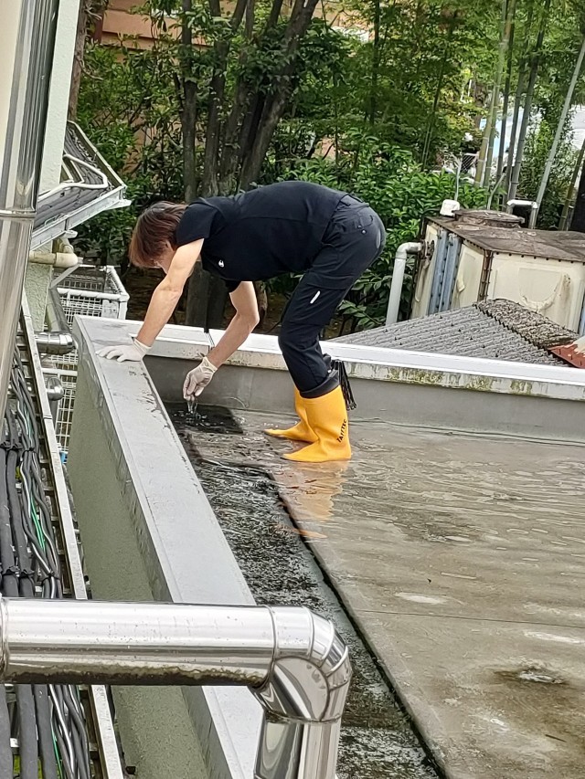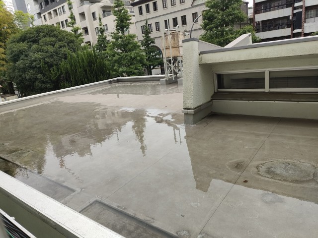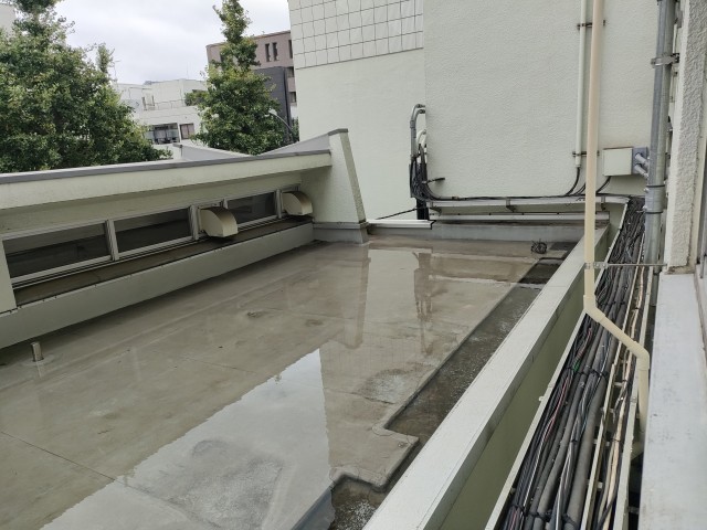 写真は、給食室の屋根です。 排管がつまり水がたまっていて・・・・