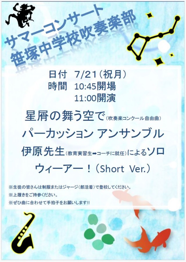 7/21(祝月)の11:00~大体育館で、サマーコンサートを開催します。