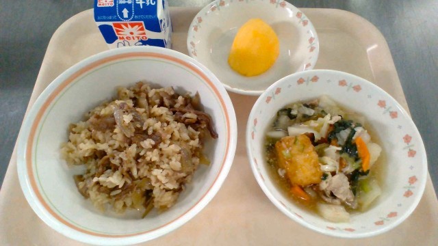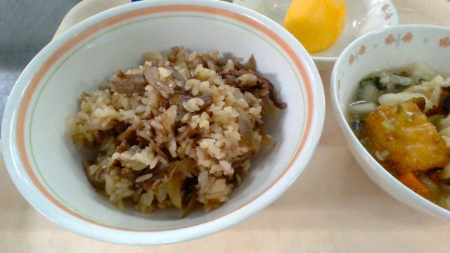 10月16日(木)の献立 公開日 2025/10/17 更新日 2025/10/17 今日の給食 ・牛ごぼうご飯・牛乳・揚げだし豆腐・柿牛肉とごぼうを炒めて、酒・醤油・砂糖で炊いてご飯に混ぜました🍚揚げだし豆腐は、揚げた豆腐と野菜あんをお椀によそっていただきました。柿も出回っていますね。立派な柿が届きました☺