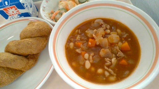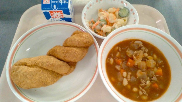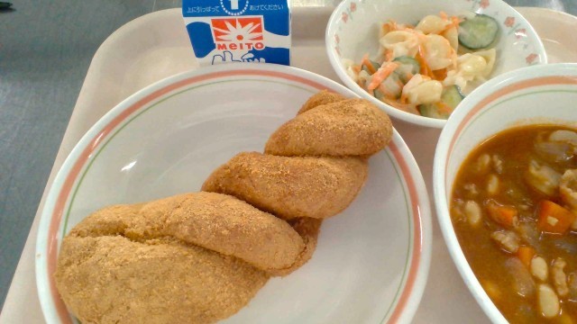 11月14日(金)の献立 公開日 2025/11/14 更新日 2025/11/14 今日の給食 ・揚げパン・牛乳・マカロニサラダ・ポークビーンズ揚げパンは油の温度が大切です。180℃~200℃に設定して、天地を返しながら素早く揚げます。仕上げのきな粉は、ひとつずつパートさんが丁寧にまぶしてくださいました。