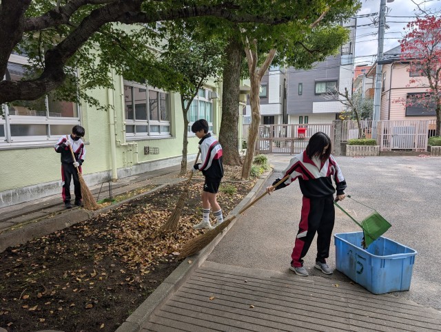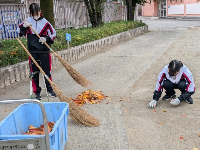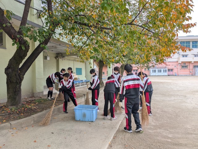 最初はほうきの使い方もままならない部員もいましたが、だんだん葉っぱが集まりきれいになっていくのが楽しくなったようです。