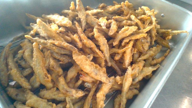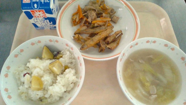 11月20日(木)の献立 公開日 2025/11/20 更新日 2025/11/20 今日の給食 ・さつま芋ご飯・牛乳・わかさぎスパイス揚げ・きんぴらごぼう・白菜スープさつまいもご飯は、角切りにしたさつま芋を蒸してご飯と合わせました。わかさぎは北海道産です。子持ちわかさぎも入っています。チリパウダーと塩こしょうで味付けました。