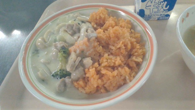 12月16日(火)の献立 公開日 2025/12/16 更新日 2025/12/16 今日の給食 ・チキンクリームライス・牛乳・白菜スープクリームシチューをご飯にかけるのは…という方に一度お試しいただきたい方法があります。それはライスを味付きにすることです。今日はケチャップ・醤油・カレー粉で味付けました🍛