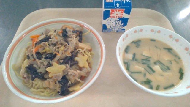 12月17日(水)の献立 公開日 2025/12/17 更新日 2025/12/17 今日の給食 ・五目あんかけ焼きそば・牛乳・坦々スープ五目あんは【豚肉・白菜・人参・もやし・玉ねぎ・油揚げ・かまぼこ・筍・きくらげ】を入れました。スープは仕上げに練りごまと豆乳を入れています。早く食べる学年もあったので、今日は辛さ控えめです🔥