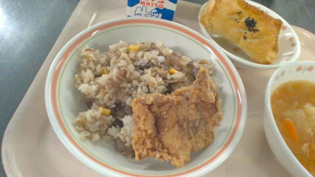 12月24日(水)の献立 公開日 2025/12/24 更新日 2025/12/24 今日の給食 ・ガーリックライス・牛乳・フライドチキン・トマトコンソメスープ・スイートポテトパイガーリックライスにはみじん切りのにんにくをたっぷり使用しました。フライドチキンは調味液に漬けこんで、片栗粉と薄力粉をまぶして揚げています。スイートポテトパイは安納芋ペーストをつつんでオーブンで焼きました🎄