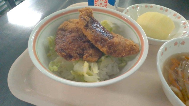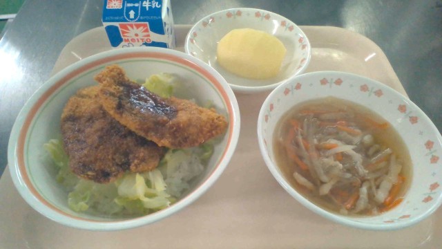 1月21日(水)の献立 公開日 2026/01/21 更新日 2026/01/21 今日の給食 ・ソースカツ丼・牛乳・沢煮椀・果物(りんご)福井県では【カツ丼】というと【ソースカツ丼】を指すことが多いです。日本全体では【カツ丼】といえば、卵とじのカツ丼でしょうか?今日は3年生の受験祈願で、ソースカツ丼にしました。お肉屋さんに豚ひれ肉を届けていただきました🍚しゃきしゃきのリンゴは青森県産です🍎