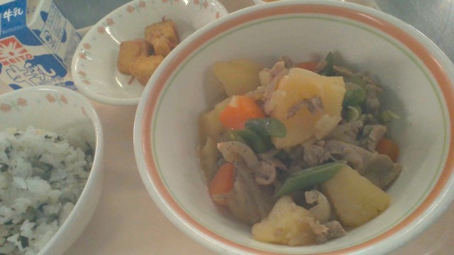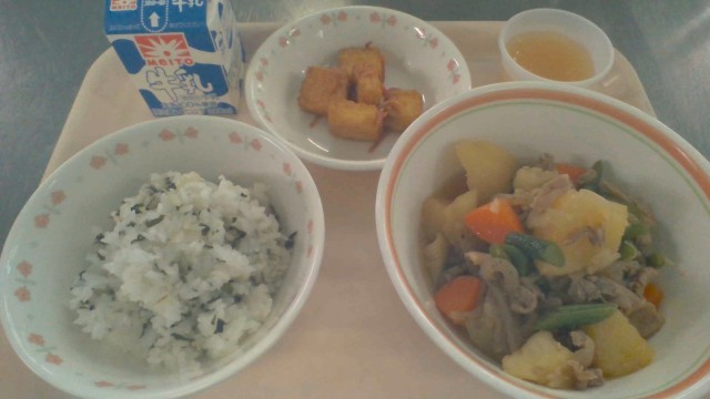 2月27日(金)の献立 公開日 2026/02/27 更新日 2026/02/27 今日の給食 ・わかめご飯・牛乳・肉じゃが・厚揚げのソース炒め・ピーチゼリーわかめご飯には押麦を入れています。わかめご飯といえば、麦入りご飯のイメージなのです。お休みも多かったのですが、今日もよく食べてくれました🍙ピーチゼリーにはナタデココを入れました🍮