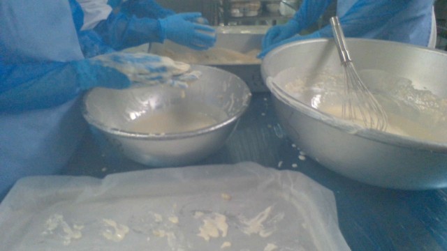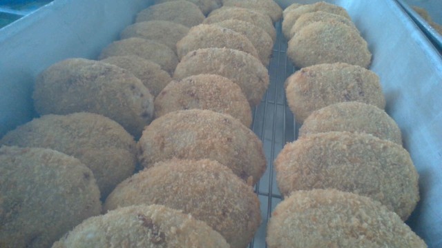 今日はコロッケサンドです。玉ねぎとひき肉を炒めて、じゃが芋は茹でてつぶして、成形してどろをくぐらせてパン粉をつけて。作業工程の多い料理です。調理さんみんなで協力して作業します。