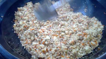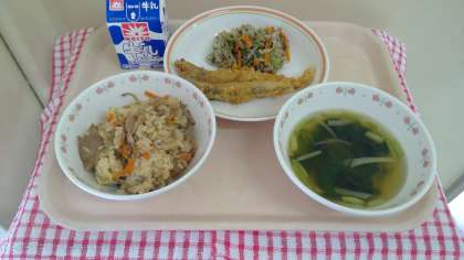 9月14日(火)の献立 公開日 2021/09/14 更新日 2021/09/14 今日の給食 ・きんぴらご飯 ・牛乳 ・ししゃもフライ ・ゆかり粉和え ・すまし汁 味付きご飯は、具材とご飯を別々に作り、最後に混ぜ合わせて作ります。味にムラが出ないように、ヘラでせっせと混ぜています。すまし汁に入れたかまぼこは、月見うさぎです🐇 食材産地 ごぼう 宮崎 人参 北海道 キャベツ 長野 玉ねぎ 北海道 小松菜 埼玉 ししゃも アイスランド 豚肉 茨城