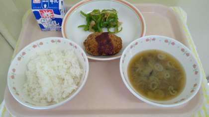 9月16日(木)の献立 公開日 2021/09/17 更新日 2021/09/17 今日の給食 ・ご飯 ・牛乳 ・メンチカツ ・おかかピーマン ・味噌汁 今日はメンチカツです!給食室で肉だねを作り一つずつ揚げて作ります。ピーマンはレモンよりビタミンが多いそうです。たくさん食べましょう。 食材産地 玉ねぎ 北海道 ピーマン 岩手 長ねぎ 山形 豚肉 茨城 やきのり 国産