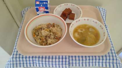 ししじゅうしは沖縄料理です。「しし」は「豚肉」、「じゅうし」は「雑炊」という意味があるそうです。豚肉・刻み昆布・針生姜などを混ぜたご飯です。高野豆腐は下味をつけて、卵と粉をまぶして揚げました。