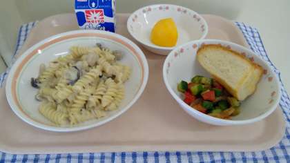 今日は渋谷ワンダフル給食です。ショートパスタにきのこがたっぷり入ったクリームソースを合わせました。クロスティーニはイタリア料理の前菜だそうです。トーストしたパンに色々な食材をのせて食べます。今日はアンチョビソースで和えた野菜を乗せて頂きます。柿は色々な産地がありますが、今日は奈良の柿が届きました。