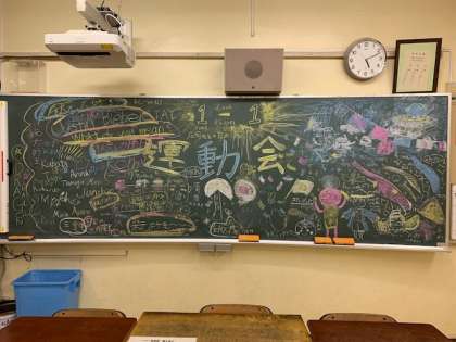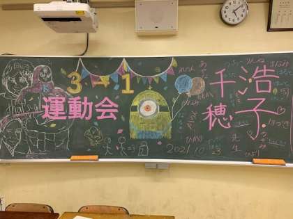 第73回運動会(1) 公開日 2021/10/26 更新日 2021/10/26 お知らせ 23日(土)6月から延期した運動会を実施しました。前日の雨が心配でしたが、秋晴れの中、生徒の全力で取り組んでいる姿はとても素晴らしかったです。保護者の皆様も1日応援ありがとうございました。教室にはクラスの団結を誓う、黒板アートが描かれていました。