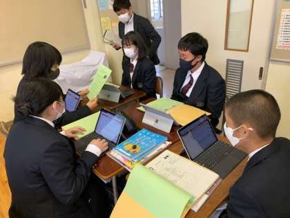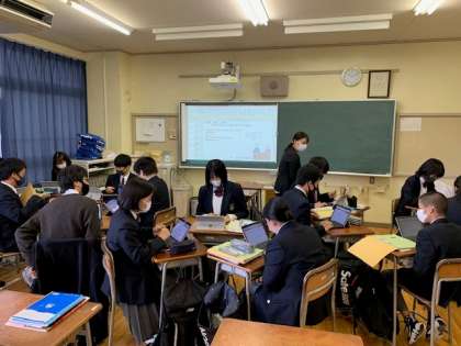 研究授業 公開日 2021/10/27 更新日 2021/10/27 お知らせ 本日2校時、2年生英語の授業で、講師を招き研究授業を行いました。「アメリカから日本にホームステイするならどの時期がおすすめか」、グループでタブレットを活用し、意見をまとめ、最後に他教室とオンラインでつなぎ、発表を共有しました。情報教育研究推進校としての取り組みの一環で、授業改善に努めています。
