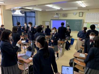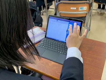 授業の様子 公開日 2021/11/19 更新日 2021/11/19 お知らせ 3年英語。もちろん授業はすべて英語で進められています。生徒も先生の説明をよく聞き、積極的に活動に取り組んでいます。ペアワークでも、楽しそうにコミュニケーションをとり、よく発話しています。タブレットを活用し、本時の課題となる文法問題に取り組んでいました。