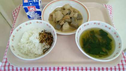 里芋は芋類の中でも低カロリーだそうです。つるつると滑るので、調理室では軍手をして皮むきをしています。ふりかけには、しらす・ごま・塩昆布・かつお節が入っています。すまし汁には雪だるまのかまぼこを入れました⛄
