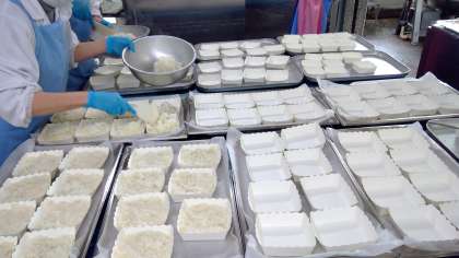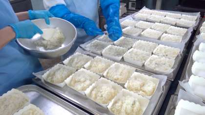 紙トレーにご飯を入れていきます。ミートソースもできました。…ということは?