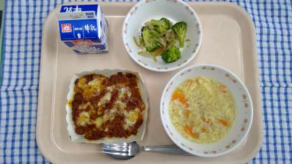 12月3日(金)の献立 公開日 2021/12/03 更新日 2021/12/03 今日の給食 ・ミートソースドリア ・牛乳 ・ブロッコリーソテー ・コーン卵スープ ドリアは食べるのはあっという間ですが、調理工程は時間がかかります。調理さん一丸となって作ってくれました。ブロッコリーもきちんと食べられるでしょうか…? 食材産地 にんにく 青森 玉ねぎ 北海道 人参 千葉 セロリ 静岡 ブロッコリー 埼玉 豚肉 茨城