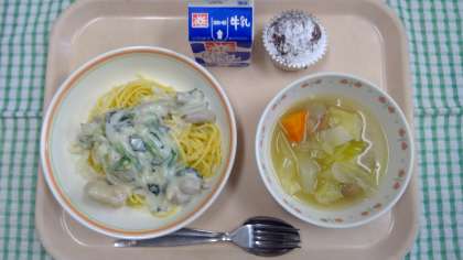 ココアカップケーキは今月のリクエストメニューです。仕上げに粉砂糖をかけました⛄クリームソースとポトフには野菜がたっぷり入っています。