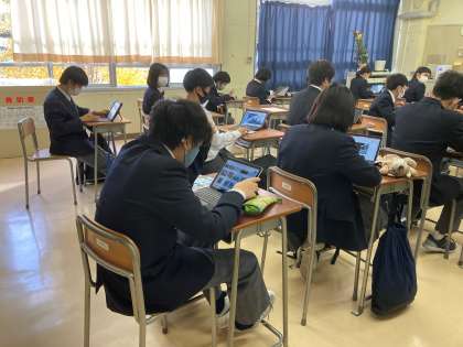 1枚目の写真は、1年生が校外学習の様子を発表に向けてまとめているところです。みんな黙々と作業中です。