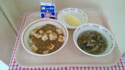 今日は2年生が午後からお出かけです。早く準備ができて早く食べられるように…そんな日は麻婆豆腐が登場します☺気をつけていってきてほしいと思います。