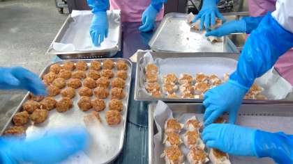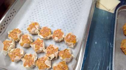 今日は冬至なので、南瓜入りシュウマイです。今日のシュウマイ大会目標タイムは、30分以内に450個です。