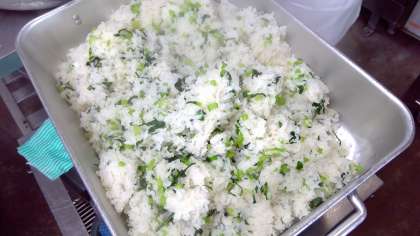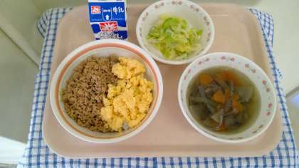 給食時間はとても短いので、クラスでの配膳はスピード勝負です。どうしたら上手に盛り付けられるか、生徒は一生懸命頑張っています。参考になるように、1人分の盛り付けたサンプルを2階の廊下に置いてあります。