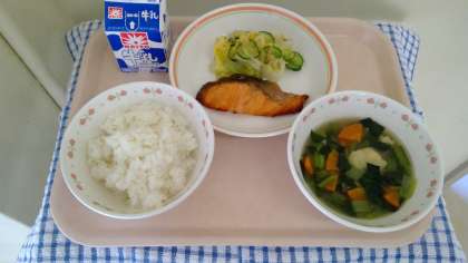 日本で一番初めに出された給食は、「塩むすび、鮭塩焼き、たくあん」といわれています。今日はその給食にすいとんを合わせました。すいとんは昔ながらの料理ですが、特に食糧不足の時代に食べられていたそうです。今日は鯖節の出汁に、小麦粉を練ってつみ入れて作りました。