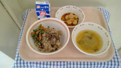2月16日(水)の献立 公開日 2022/02/16 更新日 2022/02/16 今日の給食 ・大分鶏飯 ・牛乳 ・いんげんのごま和え ・味噌汁 ・黒みつきな粉白玉 大分鶏飯はごぼう・鶏肉・にんにくを酒と醤油で炒め、ご飯と混ぜて作りました。漫画「美味しんぼ」にも出てくるそうです🍚黒みつきな粉白玉は全校生徒のリクエストメニューです🍡 食材産地 にんにく 青森 ごぼう 青森 人参 千葉 じゃが芋 鹿児島 玉ねぎ 北海道 いんげん タイ 鶏肉 北海道