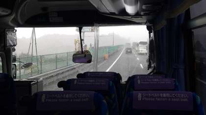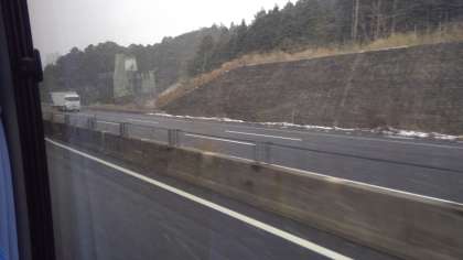 ただいま、新名神高速道路を爆進中です。バスの外は寒波の影響で先ほどから雪が降っています。積もらなければいいのですが…。