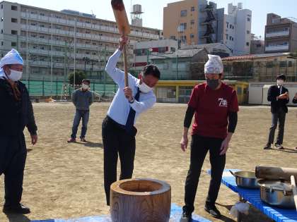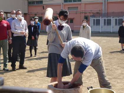 十五祭 #1 公開日 2022/03/12 更新日 2022/03/12 お知らせ 学習発表会の後は、3年間の稲作体験の集大成、十五祭です。3年生の卒業を祝い、餅つき、神輿を担ぎます。昨年できなかった餅つきを、今年は実施することができ、PTA,おやじの会の皆さん、斎藤農園の斎藤さんなど多くの方にご協力いただきました。ありがとうございました!3年生のみんなは、晴れやかな笑顔で餅つきに挑戦していました。 校長先生も初餅つきだったそうです☆