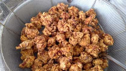 今日はノーマル味とカレー味のから揚げです🐓豚汁には祝印のなるとを入れました。
