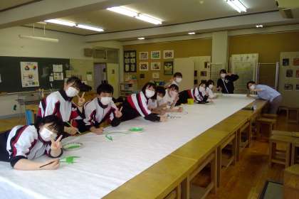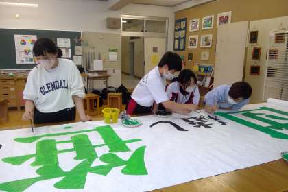 毎年運動会では、生徒会が制作したスローガンの横断幕を飾っています。今年はボランティア部の有志も協力してくれ、なんと1日で文字が塗りあがりました!本当にありがとう!当日は、晴天の中スローガンが映えるといいなぁ・・・完成をお楽しみに!