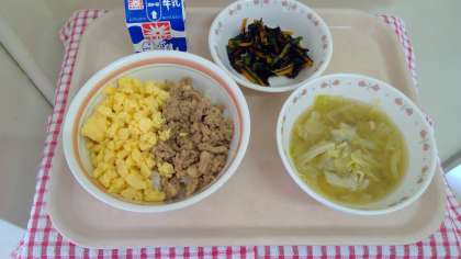 ツナそぼろと炒り卵をのせたツナそぼろ丼です🍚ひじきはあっさりナムルになりました。今日も暑いです🌞たくさん食べて、もうひと頑張りです💪