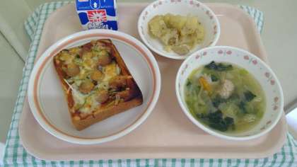 ピザトーストのソースはケチャップ・ウスター・オリーブ油です。鶏団子はよく練った鶏ひき肉を、スープにつみ落としながら作っています。