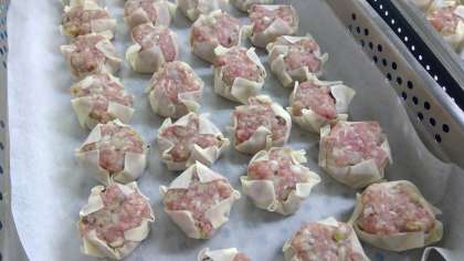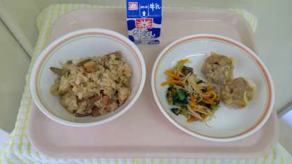 鶏飯はごぼう・鶏肉・にんにくを酒・醤油・砂糖で味付けてご飯と合わせます。シュウマイは肉だねを丸めて、上に皮を乗せて包むようにすると、どんどん包めます。6月は梅の月ということで、紀州梅をたたいておかか和えに使用しました✿