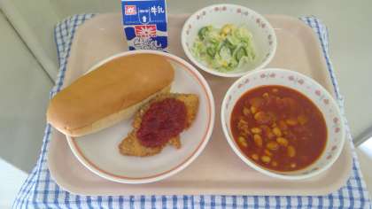 今日のフィッシュはメルルーサです。冷凍白身フライなどに使われている魚です。ポークビーンズは大豆たっぷりです。元気は1週間のスタートに、しっかり召し上がれ🍴