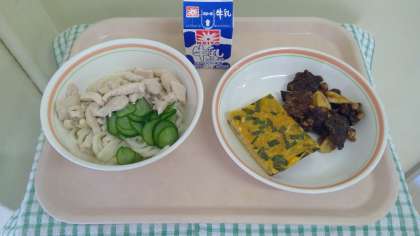 9月26日(月)の献立 公開日 2022/09/26 更新日 2022/09/26 今日の給食 ・鶏塩うどん ・牛乳 ・キムチ入り卵焼き ・レバポテビーンズ 今週は28日(水)の陸上競技大会に向けて、タンパク質・炭水化物増量の献立です🍚レバーはにんにく・生姜・酒に漬けてから揚げて、甘辛だれと和えました。 食材産地 にんにく 青森 生姜 高知 きゅうり 群馬 玉ねぎ 北海道 じゃが芋 北海道 ニラ 千葉 大豆 北海道 鶏肉 岩手 鶏レバー 岩手