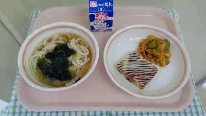 10月12日(水)の献立 公開日 2022/10/12 更新日 2022/10/12 今日の給食 ・わかめうどん ・牛乳 ・お好み焼き ・切干キムチ 今日はお好み焼きを作りました。キャベツや豚肉を薄力粉と卵の生地で焼きます。マヨネーズとオタフクソースをかけて出来上がりです。うどんは消化が早くエネルギーも低くなるので、ボリューム重視の献立です。 食材産地 ねぎ 青森 キャベツ 長野 きゅうり 群馬 切干大根 宮崎 豚肉 茨城 鶏肉 岩手