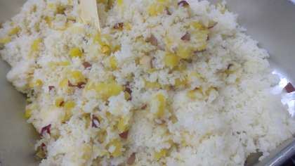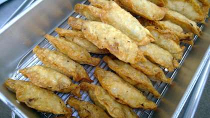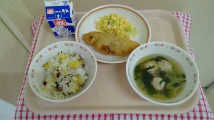 さつま芋ご飯は酒・塩・さつま芋を入れて炊きました。ジャンボ揚げ餃子の皮は15センチです。鶏団子はよく練った鶏肉をスープにつみ入れて作りました。